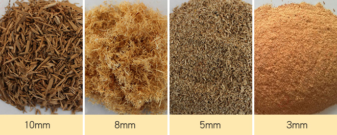 木材粉碎機出料大小根據客戶用途為其配置相應篩網決定,我們提供的篩網大小有:5mm、6mm、8mm、10mm、12mm、20mm。